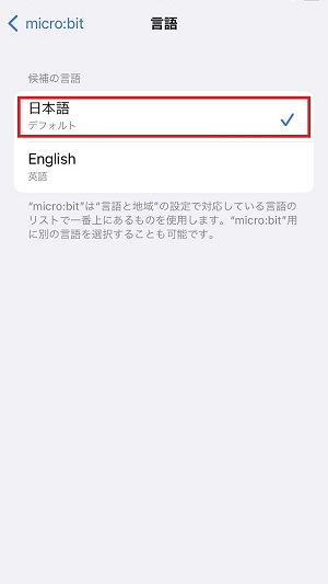| 03 | ![]() | 「日本語」をタップする。 | micro:bitアプリの表記が日本語に変更される。 |